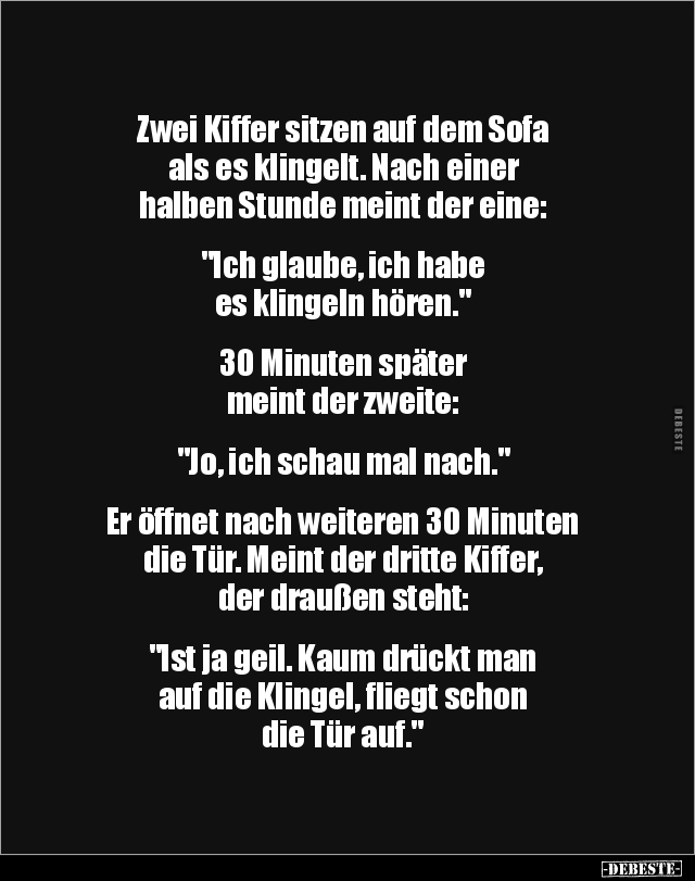 Zwei Kiffer sitzen auf dem Sofa als es klingelt. Nach einer halben Stunde meint der eine: "Ich glaube, ich habe es klingeln hören." 30 Minuten später meint der zweite: "Jo, ich schau mal nach." Er öffnet nach weiteren 30 Minuten die Tür. Meint der dritte Kiffer, der draußen steht: "Ist ja geil. Kaum drückt man auf die Klingel, fliegt schon die Tür auf."