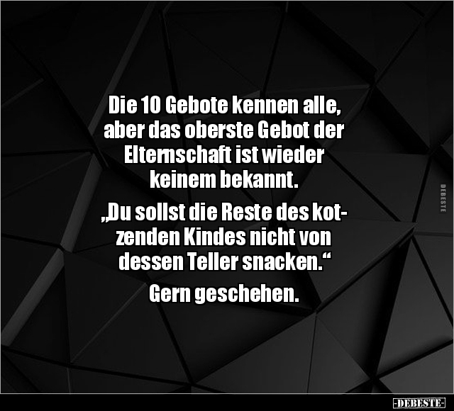 Die 10 Gebote kennen alle, aber das oberste Gebot der Elternschaft ist wieder keinem bekannt. „Du sollst die Reste des kot- zenden Kindes nicht von dessen Teller snacken.“ Gern geschehen.