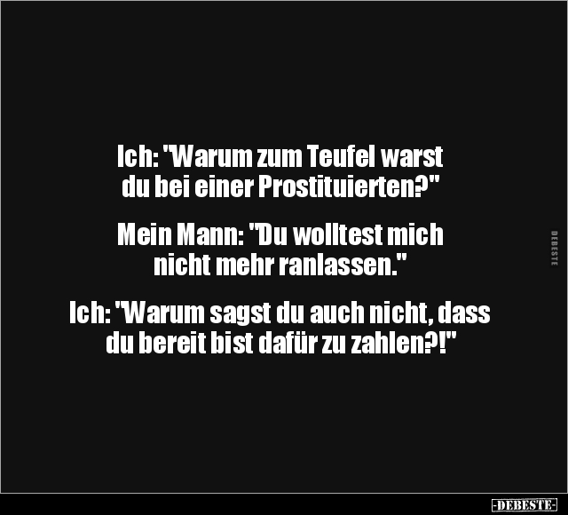 Ich: "Warum zum Teufel warst du bei einer Prostituierten?" Mein Mann: "Du wolltest mich nicht mehr ranlassen." Ich: "Warum sagst du auch nicht, dass du bereit bist dafür zu zahlen?!"