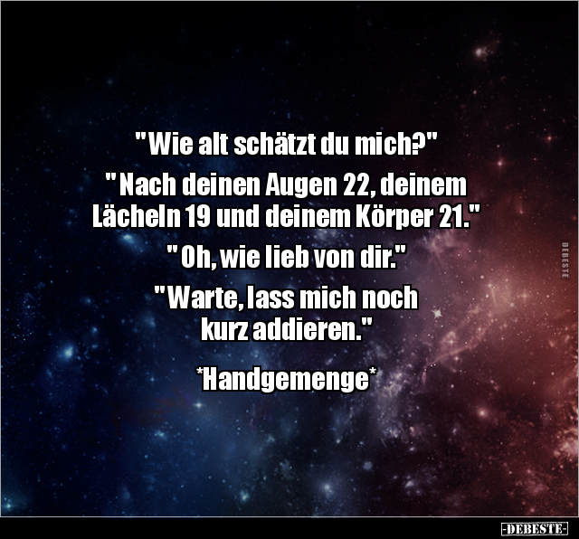 " Wie alt schätzt du mich?" " Nach deinen Augen 22, deinem Lächeln 19 und deinem Körper 21." " Oh, wie lieb von dir." " Warte, lass mich noch kurz addieren." *Handgemenge*
