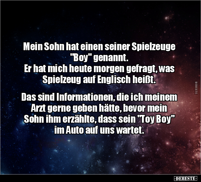Mein Sohn hat einen seiner Spielzeuge "Boy" genannt. Er hat mich heute morgen gefragt, was Spielzeug auf Englisch heißt. Das sind Informationen, die ich meinem Arzt gerne geben hätte, bevor mein Sohn ihm erzählte, dass sein "Toy Boy" im Auto auf uns wartet.