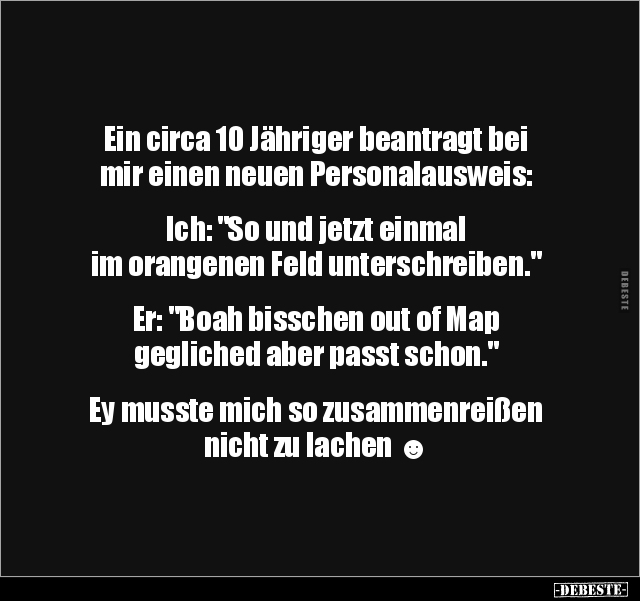 Ein circa 10 Jähriger beantragt bei mir einen neuen Personalausweis: Ich: "So und jetzt einmal im orangenen Feld unterschreiben." Er: "Boah bisschen out of Map gegliched aber passt schon." Ey musste mich so zusammenreißen nicht zu lachen ☻