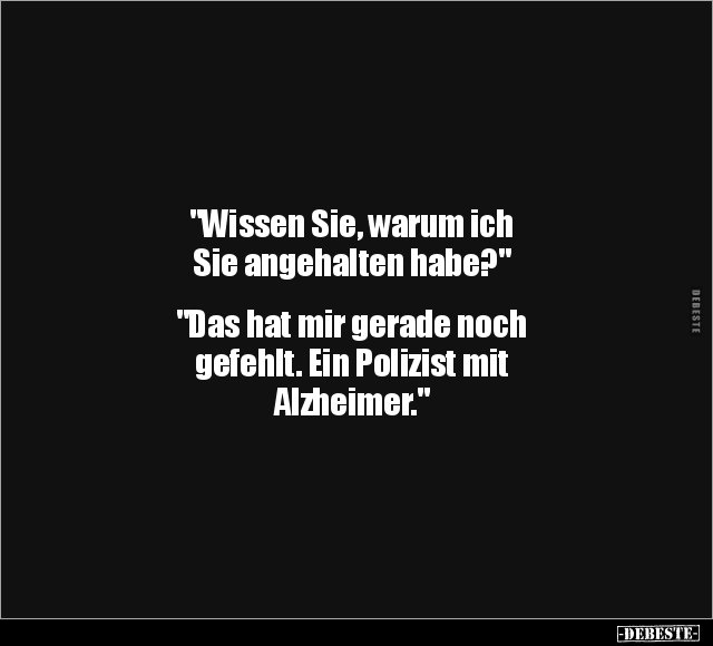"Wissen Sie, warum ich Sie angehalten habe?" "Das hat mir gerade noch gefehlt. Ein Polizist mit Alzheimer."