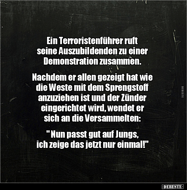 Ein Terroristenführer ruft seine Auszubildenden zu einer Demonstration zusammen. Nachdem er allen gezeigt hat wie die Weste mit dem Sprengstoff anzuziehen ist und der Zünder eingerichtet wird, wendet er sich an die Versammelten: " Nun passt gut auf Jungs, ich zeige das jetzt nur einmal!"