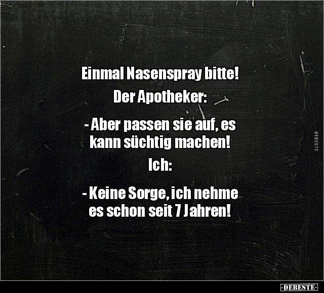 Einmal Nasenspray bitte! Der Apotheker: - Aber passen sie auf, es kann süchtig machen! Ich: - Keine Sorge, ich nehme es schon seit 7 Jahren!