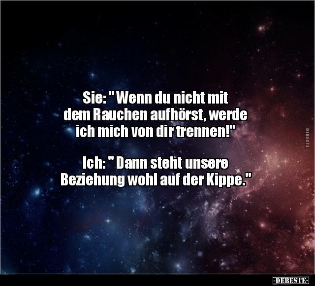 Sie: " Wenn du nicht mit dem Rauchen aufhörst, werde ich mich von dir trennen!" Ich: " Dann steht unsere Beziehung wohl auf der Kippe."