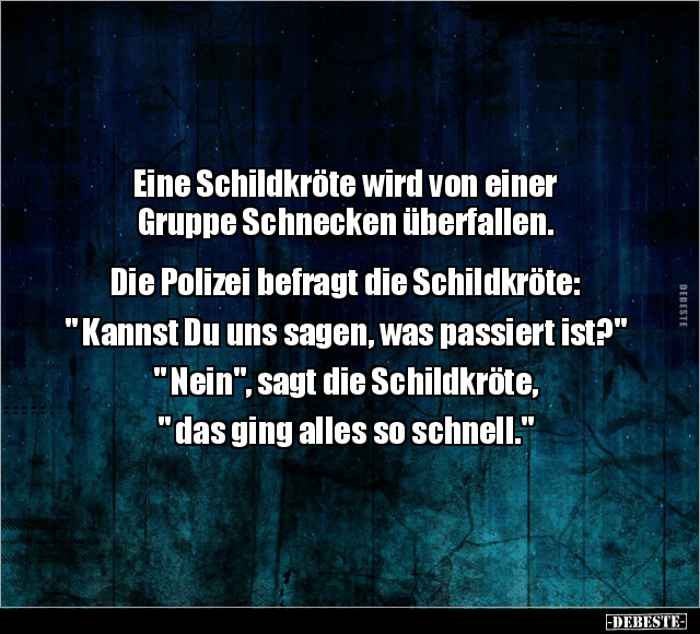 Eine Schildkröte wird von einer Gruppe Schnecken überfallen. Die Polizei befragt die Schildkröte: " Kannst Du uns sagen, was passiert ist?" " Nein", sagt die Schildkröte, " das ging alles so schnell."