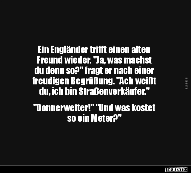 Ein Engländer trifft einen alten Freund wieder. "Ja, was machst du denn so?" fragt er nach einer freudigen Begrüßung. "Ach weißt du, ich bin Straßenverkäufer." "Donnerwetter!" "Und was kostet so ein Meter?"