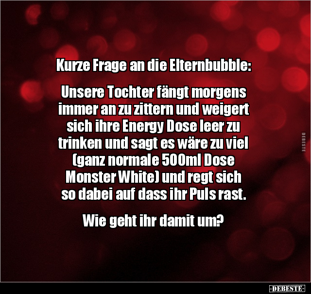 Kurze Frage an die Elternbubble: Unsere Tochter fängt morgens immer an zu zittern und weigert sich ihre Energy Dose leer zu trinken und sagt es wäre zu viel (ganz normale 500ml Dose Monster White) und regt sich so dabei auf dass ihr Puls rast. Wie geht ihr damit um?