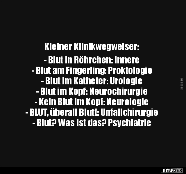 Kleiner Klinikwegweiser: - Blut in Röhrchen: Innere - Blut am Fingerling: Proktologie - Blut im Katheter: Urologie - Blut im Kopf: Neurochirurgie - Kein Blut im Kopf: Neurologie - BLUT, überall Blut!: Unfallchirurgie - Blut? Was ist das? Psychiatrie