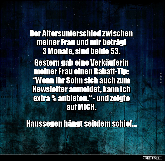 Der Altersunterschied zwischen meiner Frau und mir beträgt 3 Monate, sind beide 53. Gestern gab eine Verkäuferin meiner Frau einen Rabatt-Tip: “Wenn Ihr Sohn sich auch zum Newsletter anmeldet, kann ich extra % anbieten.“ - und zeigte auf MICH. Haussegen hängt seitdem schief...