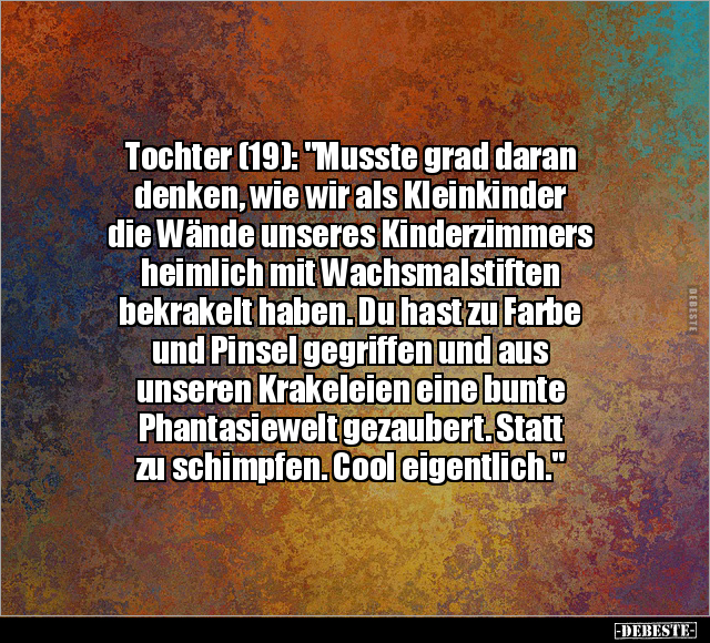 Tochter (19): "Musste grad daran denken, wie wir als Kleinkinder die Wände unseres Kinderzimmers heimlich mit Wachsmalstiften bekrakelt haben. Du hast zu Farbe und Pinsel gegriffen und aus unseren Krakeleien eine bunte Phantasiewelt gezaubert. Statt zu schimpfen. Cool eigentlich."