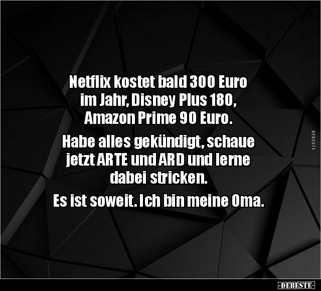 Netflix kostet bald 300 Euro im Jahr, Disney Plus 180, Amazon Prime 90 Euro. Habe alles gekündigt, schaue jetzt ARTE und ARD und lerne dabei stricken. Es ist soweit. Ich bin meine Oma.