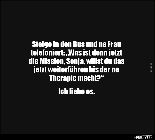 Steige in den Bus und ne Frau telefoniert: „Was ist denn jetzt die Mission, Sonja, willst du das jetzt weiterführen bis der ne Therapie macht?“ Ich liebe es.