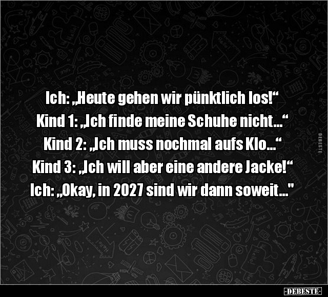 Ich: „Heute gehen wir pünktlich los!“ Kind 1: „Ich finde meine Schuhe nicht…“ Kind 2: „Ich muss nochmal aufs Klo…“ Kind 3: „Ich will aber eine andere Jacke!“ Ich: „Okay, in 2027 sind wir dann soweit…"