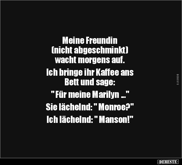 Meine Freundin (nicht abgeschminkt) wacht morgens auf. Ich bringe ihr Kaffee ans Bett und sage: " Für meine Marilyn ..." Sie lächelnd: " Monroe?" Ich lächelnd: " Manson!"