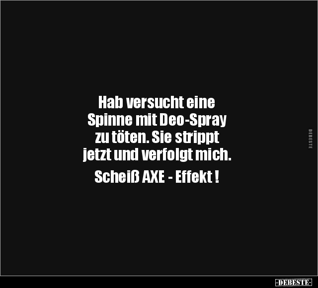 Hab versucht eine Spinne mit Deo-Spray zu töten. Sie strippt jetzt und verfolgt mich. Scheiß AXE - Effekt !