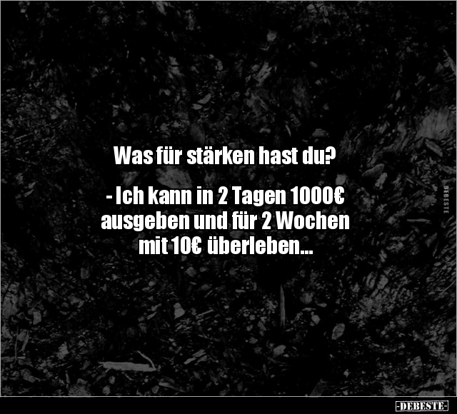 Was für stärken hast du? - Ich kann in 2 Tagen 1000€ ausgeben und für 2 Wochen mit 10€ überleben...