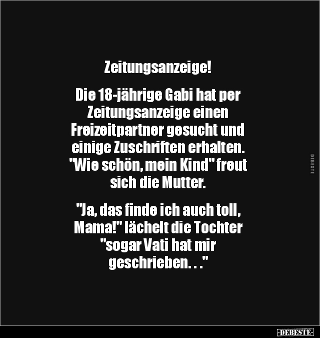 Zeitungsanzeige! Die 18-jährige Gabi hat per Zeitungsanzeige einen Freizeitpartner gesucht und einige Zuschriften erhalten. "Wie schön, mein Kind" freut sich die Mutter. "Ja, das finde ich auch toll, Mama!" lächelt die Tochter "sogar Vati hat mir geschrieben. . ."