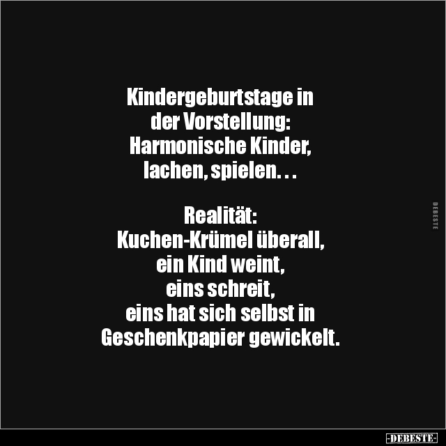 Kindergeburtstage in der Vorstellung: Harmonische Kinder, lachen, spielen. . . Realität: Kuchen-Krümel überall, ein Kind weint, eins schreit, eins hat sich selbst in Geschenkpapier gewickelt.