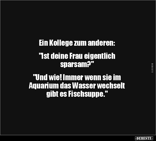 Ein Kollege zum anderen: "Ist deine Frau eigentlich sparsam?" "Und wie! Immer wenn sie im Aquarium das Wasser wechselt gibt es Fischsuppe."