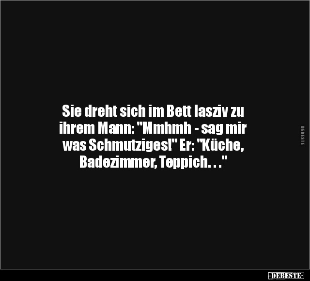 Sie dreht sich im Bett lasziv zu ihrem Mann: "Mmhmh - sag mir was Schmutziges!" Er: "Küche, Badezimmer, Teppich. . ."