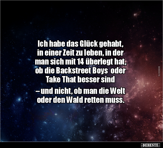 Ich habe das Glück gehabt, in einer Zeit zu leben, in der man sich mit 14 überlegt hat, ob die Backstreet Boys oder Take That besser sind – und nicht, ob man die Welt oder den Wald retten muss.