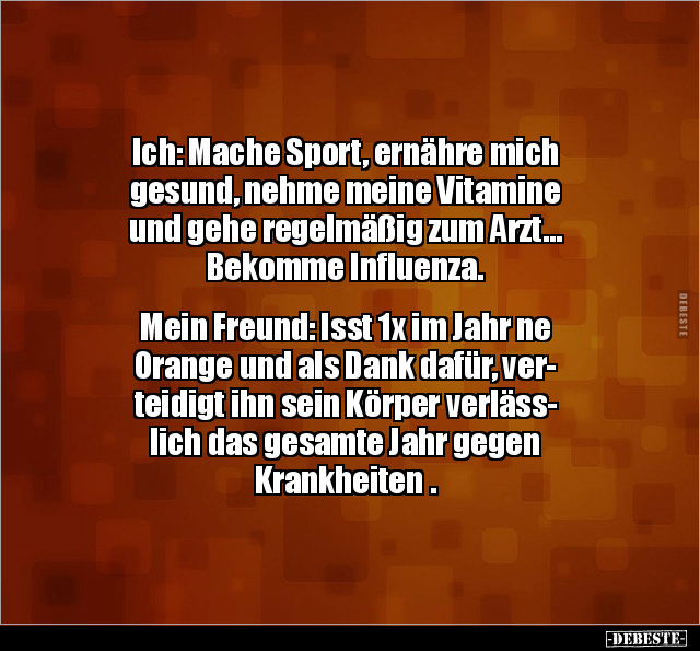 Ich: Mache Sport, ernähre mich gesund, nehme meine Vitamine und gehe regelmäßig zum Arzt... Bekomme Influenza. Mein Freund: Isst 1x im Jahr ne Orange und als Dank dafür, ver- teidigt ihn sein Körper verläss- lich das gesamte Jahr gegen Krankheiten .