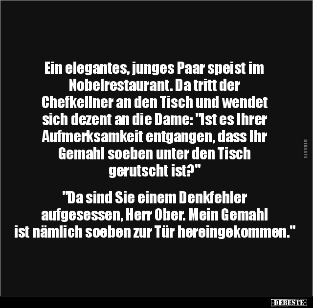 Ein elegantes, junges Paar speist im Nobelrestaurant. Da tritt der Chefkellner an den Tisch und wendet sich dezent an die Dame: "Ist es Ihrer Aufmerksamkeit entgangen, dass Ihr Gemahl soeben unter den Tisch gerutscht ist?" "Da sind Sie einem Denkfehler aufgesessen, Herr Ober. Mein Gemahl ist nämlich soeben zur Tür hereingekommen."