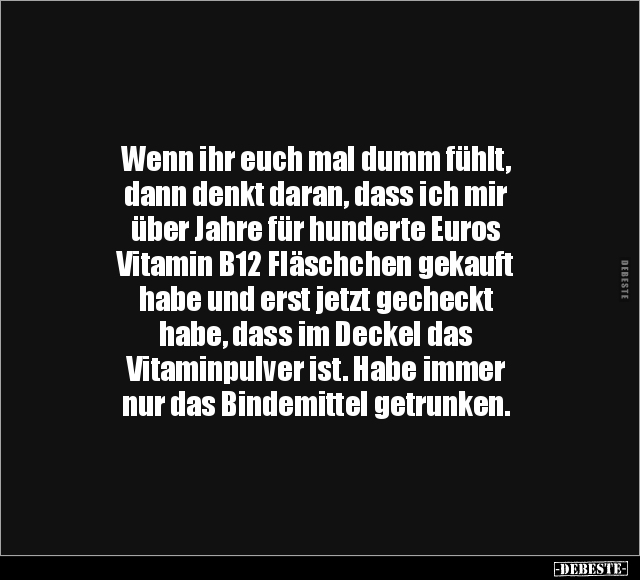 Wenn ihr euch mal dumm fühlt, dann denkt daran, dass ich mir über Jahre für hunderte Euros Vitamin B12 Fläschchen gekauft habe und erst jetzt gecheckt habe, dass im Deckel das Vitaminpulver ist. Habe immer nur das Bindemittel getrunken.