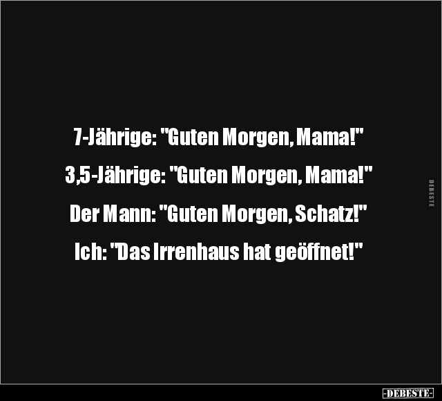 7-Jährige: "Guten Morgen, Mama!" 3,5-Jährige: "Guten Morgen, Mama!" Der Mann: "Guten Morgen, Schatz!" Ich: "Das Irrenhaus hat geöffnet!"