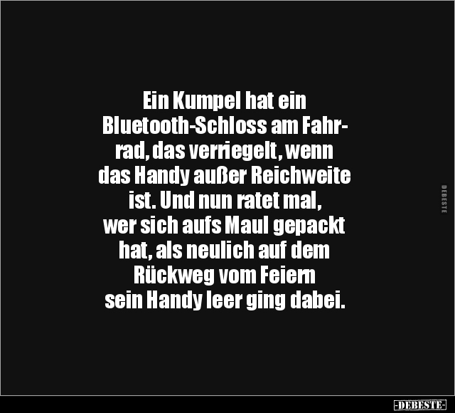 Ein Kumpel hat ein Bluetooth-Schloss am Fahr- rad, das verriegelt, wenn das Handy außer Reichweite ist. Und nun ratet mal, wer sich aufs Maul gepackt hat, als neulich auf dem Rückweg vom Feiern sein Handy leer ging dabei.