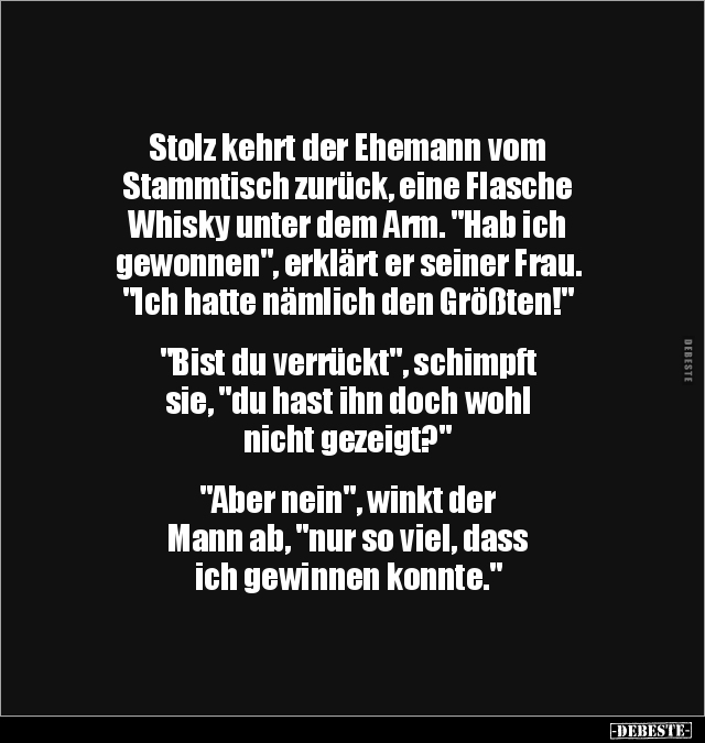 Stolz kehrt der Ehemann vom Stammtisch zurück, eine Flasche Whisky unter dem Arm. "Hab ich gewonnen", erklärt er seiner Frau. "Ich hatte nämlich den Größten!" "Bist du verrückt", schimpft sie, "du hast ihn doch wohl nicht gezeigt?" "Aber nein", winkt der Mann ab, "nur so viel, dass ich gewinnen konnte."