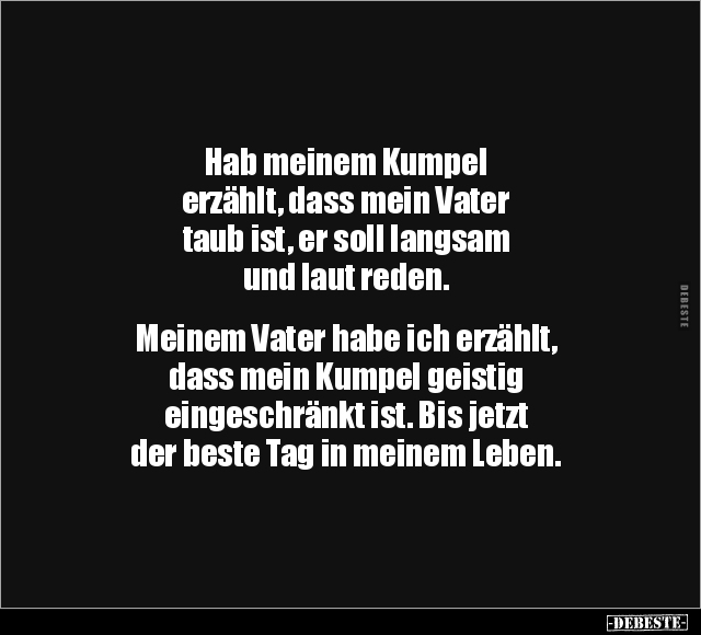 Hab meinem Kumpel erzählt, dass mein Vater taub ist, er soll langsam und laut reden. Meinem Vater habe ich erzählt, dass mein Kumpel geistig eingeschränkt ist. Bis jetzt der beste Tag in meinem Leben.