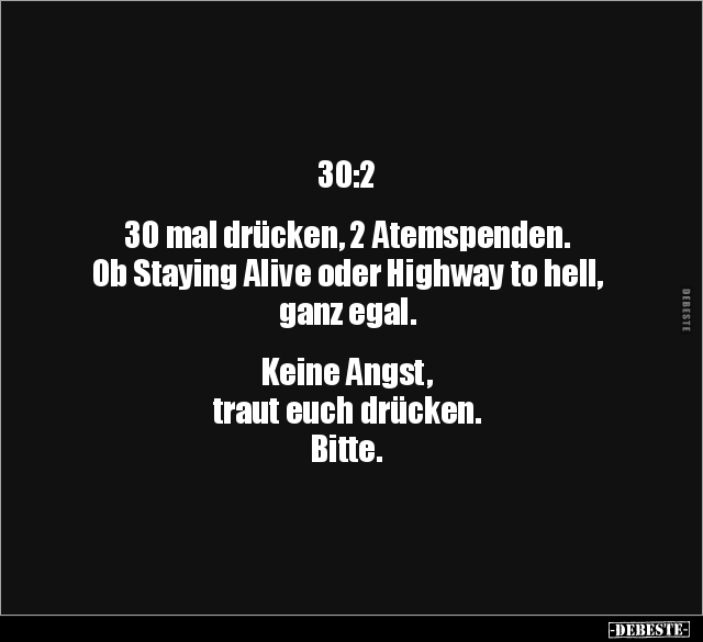 30:2 30 mal drücken, 2 Atemspenden. Ob Staying Alive oder Highway to hell, ganz egal. Keine Angst, traut euch drücken. Bitte.