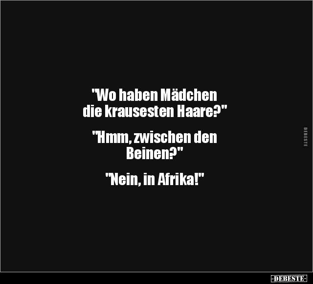"Wo haben Mädchen die krausesten Haare?" "Hmm, zwischen den Beinen?" "Nein, in Afrika!"