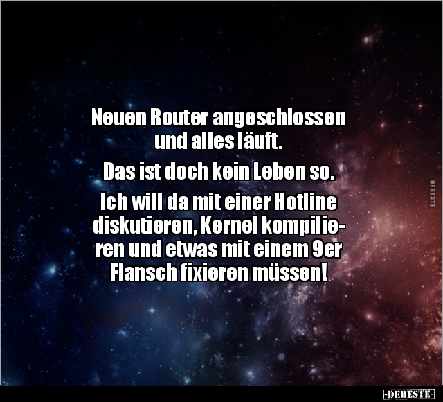 Neuen Router angeschlossen und alles läuft. Das ist doch kein Leben so. Ich will da mit einer Hotline diskutieren, Kernel kompilie- ren und etwas mit einem 9er Flansch fixieren müssen!