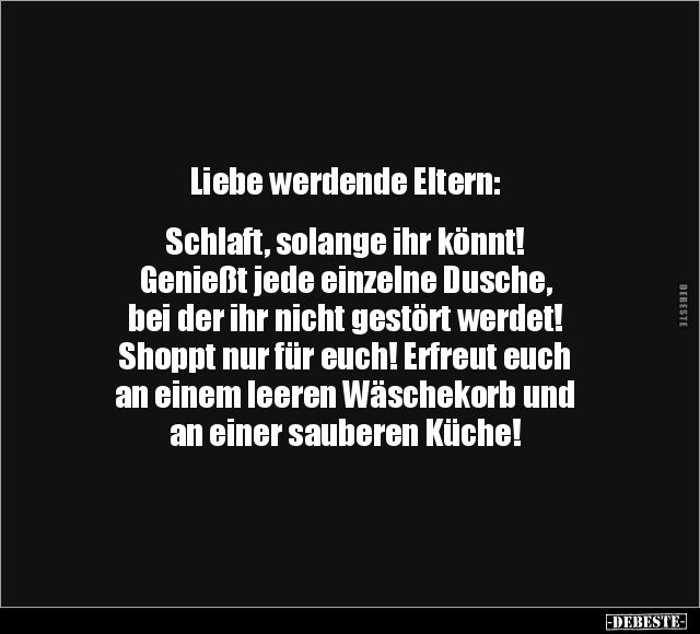 Liebe werdende Eltern: Schlaft, solange ihr könnt! Genießt jede einzelne Dusche, bei der ihr nicht gestört werdet! Shoppt nur für euch! Erfreut euch an einem leeren Wäschekorb und an einer sauberen Küche!