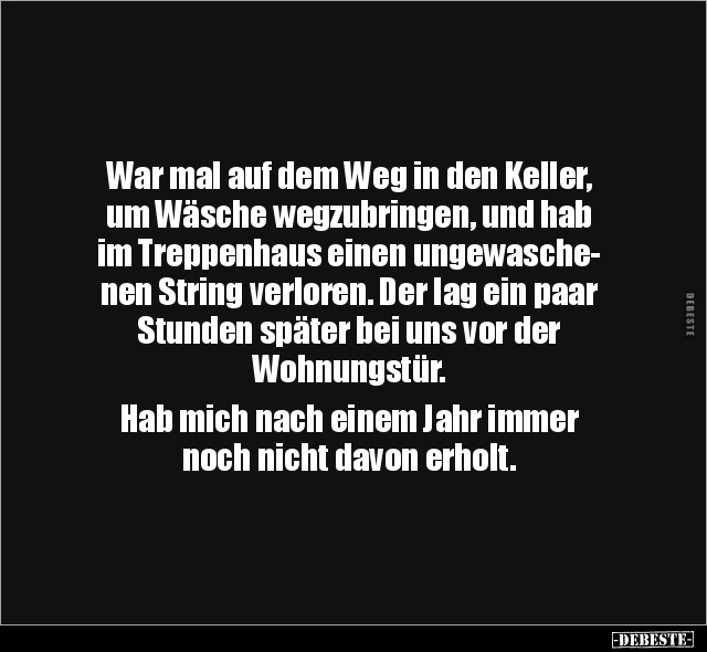 War mal auf dem Weg in den Keller, um Wäsche wegzubringen, und hab im Treppenhaus einen ungewasche- nen String verloren. Der lag ein paar Stunden später bei uns vor der Wohnungstür. Hab mich nach einem Jahr immer noch nicht davon erholt.