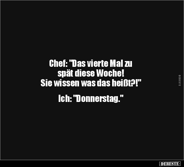 Chef: "Das vierte Mal zu spät diese Woche! Sie wissen was das heißt?!" Ich: "Donnerstag."