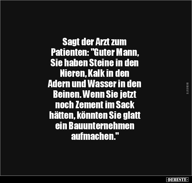 Sagt der Arzt zum Patienten: "Guter Mann, Sie haben Steine in den Nieren, Kalk in den Adern und Wasser in den Beinen. Wenn Sie jetzt noch Zement im Sack hätten, könnten Sie glatt ein Bauunternehmen aufmachen."