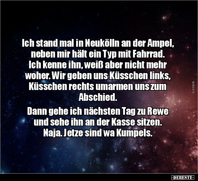 Ich stand mal in Neukölln an der Ampel, neben mir hält ein Typ mit Fahrrad. Ich kenne ihn, weiß aber nicht mehr woher. Wir geben uns Küsschen links, Küsschen rechts umarmen uns zum Abschied. Dann gehe ich nächsten Tag zu Rewe und sehe ihn an der Kasse sitzen. Naja. Jetze sind wa Kumpels.