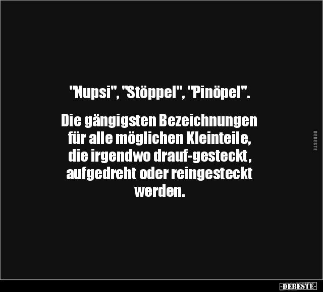 "Nupsi", "Stöppel", "Pinöpel". Die gängigsten Bezeichnungen für alle möglichen Kleinteile, die irgendwo drauf-gesteckt, aufgedreht oder reingesteckt werden.