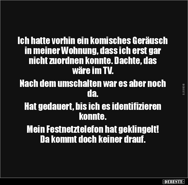 Ich hatte vorhin ein komisches Geräusch in meiner Wohnung, dass ich erst gar nicht zuordnen konnte. Dachte, das wäre im TV. Nach dem umschalten war es aber noch da. Hat gedauert, bis ich es identifizieren konnte. Mein Festnetztelefon hat geklingelt! Da kommt doch keiner drauf.