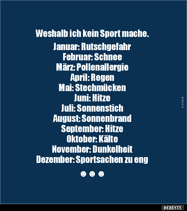 Weshalb ich kein Sport mache. Januar: Rutschgefahr Februar: Schnee März: Pollenallergie April: Regen Mai: Stechmücken Juni: Hitze Juli: Sonnenstich August: Sonnenbrand September: Hitze Oktober: Kälte November: Dunkelheit Dezember: Sportsachen zu eng ☻☻☻