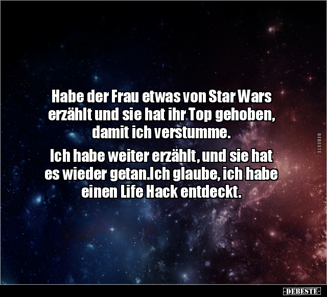 Habe der Frau etwas von Star Wars erzählt und sie hat ihr Top gehoben, damit ich verstumme. Ich habe weiter erzählt, und sie hat es wieder getan.Ich glaube, ich habe einen Life Hack entdeckt.
