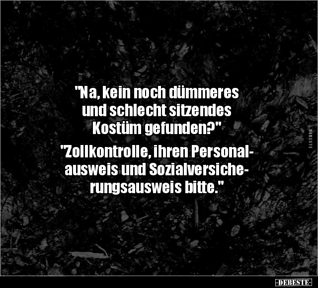 "Na, kein noch dümmeres und schlecht sitzendes Kostüm gefunden?" "Zollkontrolle, ihren Personal- ausweis und Sozialversiche- rungsausweis bitte."