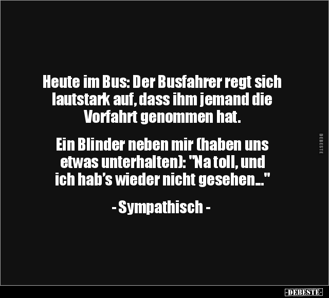 Heute im Bus: Der Busfahrer regt sich lautstark auf, dass ihm jemand die Vorfahrt genommen hat. Ein Blinder neben mir (haben uns etwas unterhalten): "Na toll, und ich hab’s wieder nicht gesehen..." - Sympathisch -
