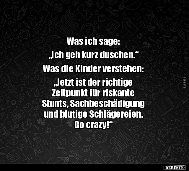 Was ich sage: „Ich geh kurz duschen.“ Was die Kinder verstehen: „Jetzt ist der richtige Zeitpunkt für riskante Stunts, Sachbeschädigung und blutige Schlägereien. Go crazy!“