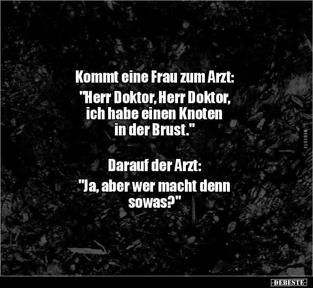 Kommt eine Frau zum Arzt: "Herr Doktor, Herr Doktor, ich habe einen Knoten in der Brust." Darauf der Arzt: "Ja, aber wer macht denn sowas?"